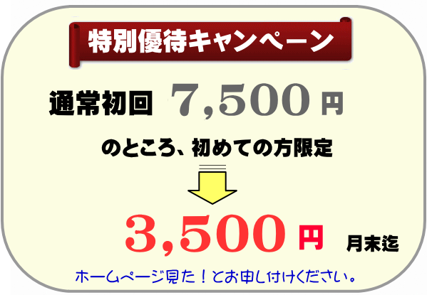 | 通常初回7,500円のところ、 予約時にホームページを見たとお伝えください。 ポイントがたまるとサプリメント等を差し上げています。 *予約時にホームページを見たとお伝えください。 |